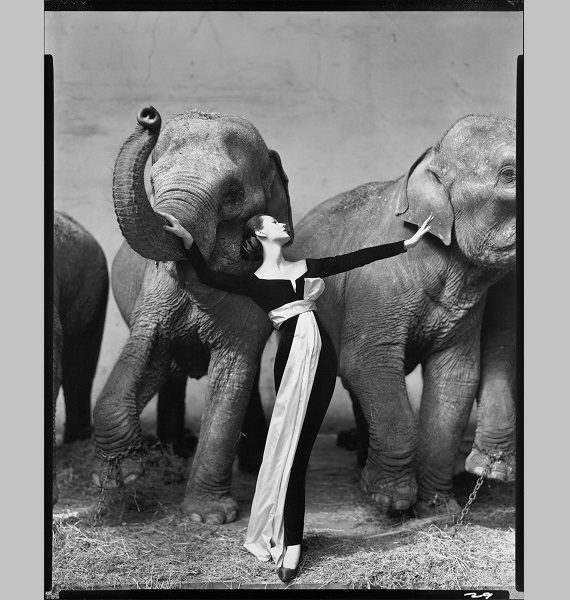 تصویر ۷. ریچارد اَودن. دُویما و فیلها، جامهی رسمی دیور، سیرک زمستانی، پاریس، آگوست ۱۹۵۵. عکس نقره ژلاتین. -