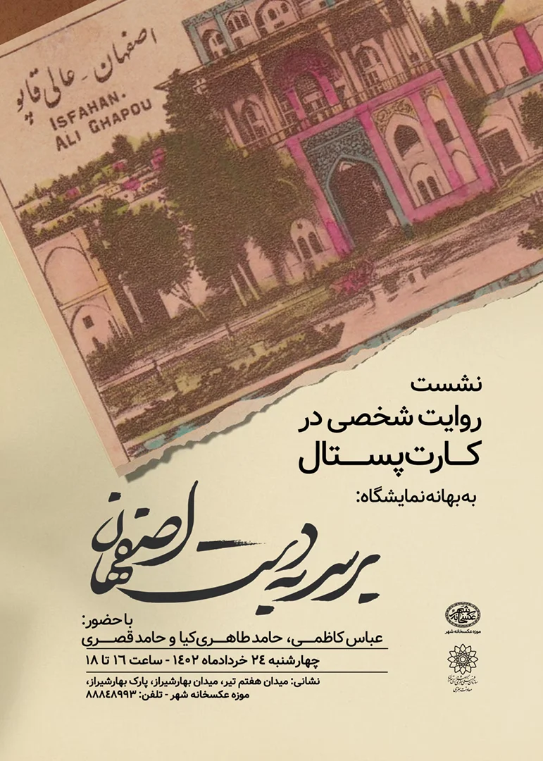 به مناسبت برگزاری نمایشگاه «برسد به دست اصفهان؛ یکصد سال کارت پستالهای اصفهان»، نشستی با عنوان «روایت شخصی در کارت پستال» با گفتاری از دکتر عباس کاظمی پژوهشگر و جامعهشناس و دکتر حامد طاهریکیا پژوهشگر و دانشآموخته مطالعات و سیاستگذاری فرهنگی در موزه عکسخانه شهر برگزار میگردد.