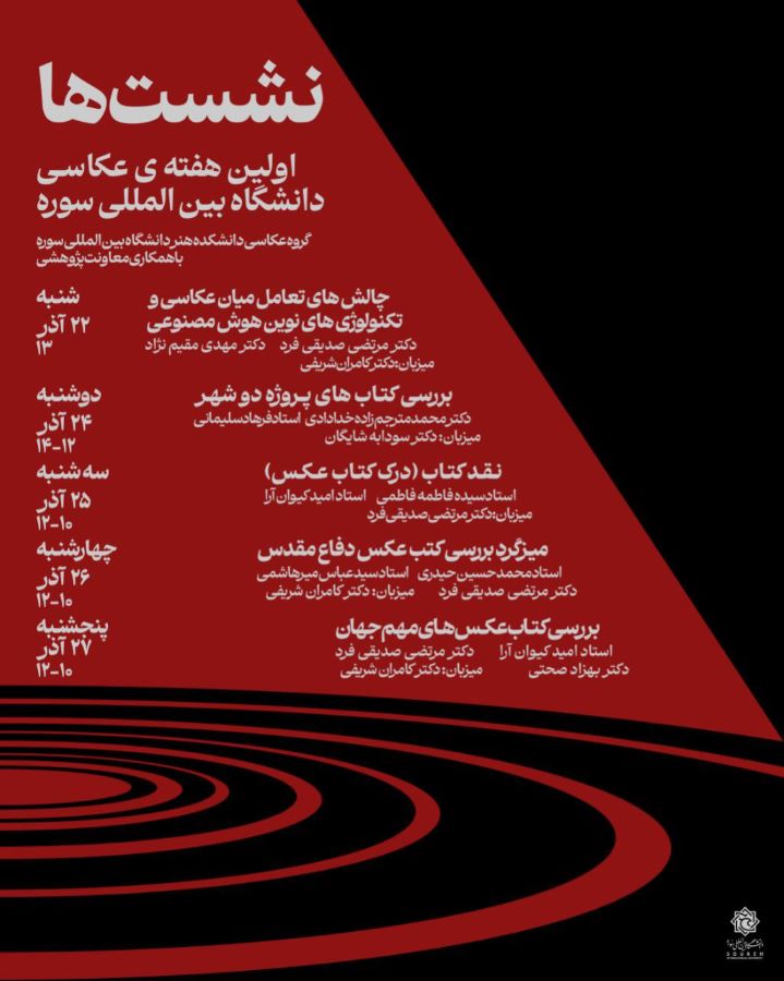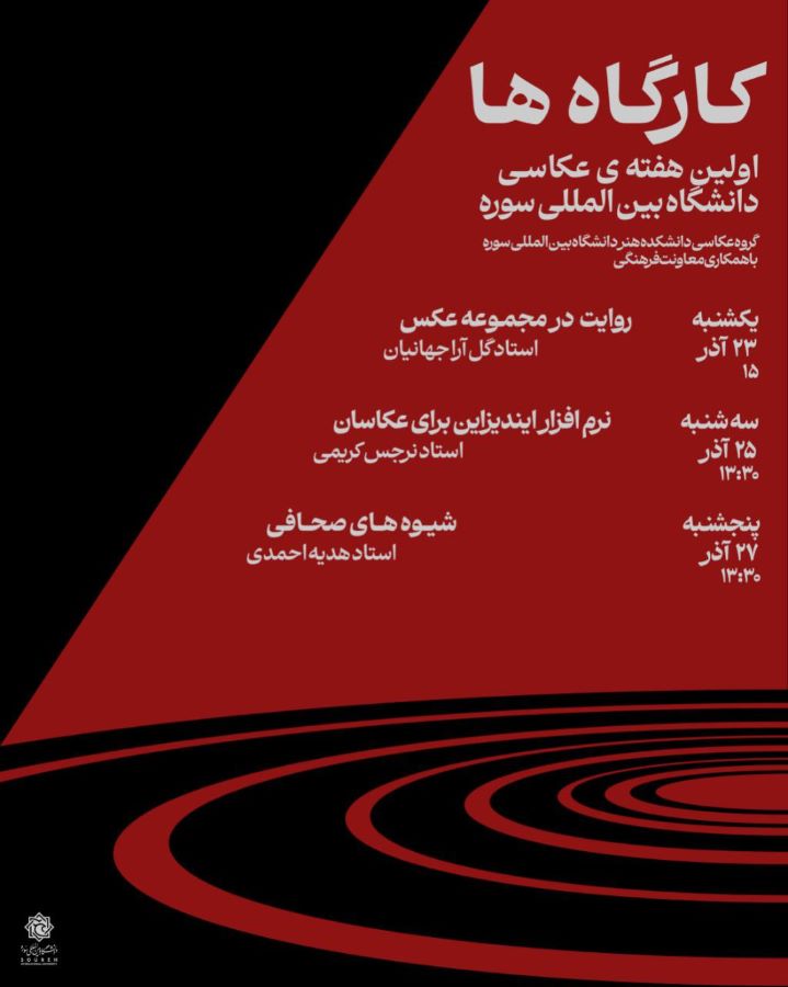 گروه عکاسی دانشکده هنر دانشگاه بینالمللی سوره با همکاری معاونت فرهنگی و معاونت پژوهشی، نخستین هفتهی عکاسی دانشگاه بینالمللی سوره را برگزار میکند.