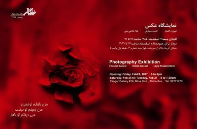 روز جمعه ۴ اسفند نمایشگاه گروهی عکس با نمایش آثار فیروزه کامیار، انسیه سیاوش و لیلا خادمی بمی با...